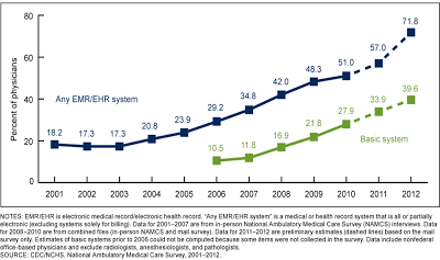 The HHS press release states that, “[a]ccording to the Centers for Disease Control and Prevention (CDC) survey in 2012, the percent of physicians using an advanced EHR system was just 17 percent in 2008. Today, more than 50 percent of eligible professionals (mostly physicians) have demonstrated meaningful use and received an incentive payment”. Examining the 2012 CDC survey results, shown below, it turns out that when talking about “advanced EHR”, HHS is referring to what CDC termed “basic EHR”, which is fine as long as we translate correctly.The CDC survey results clearly show that somewhere around 2004 EHR adoption among office-based physicians began climbing at a more or less constant rate, with over 40% of doctors using an EHR back in 2008, although most were probably missing this or that functionality classified as basic by the CDC (and advanced by HHS). Beginning in 2008, prevalence of Meaningful Use worthy EHRs (advanced/basic) began increasing at a similar rate. If we place the 50% adoption rate of 2013, inferred from payment of incentives by HHS, on the CDC green line graph, it should fall into the same linear growth behavior as previous years. We will have to wait for the 2013 CDC survey, but my guess would be that while the blue “Any EMR/EHR System” line will flatten significantly, the green line will shoot up and eventually converge with the blue one. The reason for this is that there really are no serious EHR products today that don’t fit the "basic/advanced" criteria, and most people that have a non Meaningful Use compliant EHR, are upgrading to a version that has all the bells and whistles.