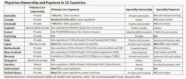 One would hope that the decision to eliminate FFS for doctors was based on something other than rattlesnake fables and whooping cough pandemics. One would also hope that decision makers observed and learned from, or at the very least considered, health systems of other wealthy nations that are supposedly better and cheaper. One would be wrong. According to the latest Commonwealth Fund international report on health care systems, it seems that many of those enlightened and cheap nations pay doctors mostly with FFS, some exclusively so, especially Germany, the economic powerhouse of the European Union. For some reason FFS seems to have no devilish toxic effects outside the international borders of the United States.![]() |