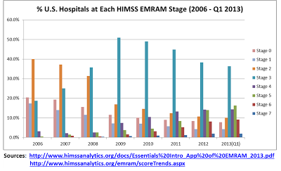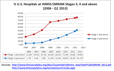 The hospital EHR adoption figures are even more dramatic. According to the HHS press release, “[f]or hospitals, just nine percent had adopted EHRs in 2008, but today, more than 80 percent have demonstrated meaningful use of EHRs”. The 9% figure for 2008, presumably comes from a 2008 survey commissioned by HHS and published in NEJM in 2009 (no source is provided in the press release). The researchers found that 1.5% of hospitals had “comprehensive” systems and 7.6% had “basic” systems, where comprehensive and basic as defined in the survey could be indicative of ability to satisfy the eventual criteria for Meaningful Use. Going from 9% EHR adoption to 80% EHR adoption for hospitals in 5 years would indeed be a miraculous feat. However, when it comes to hospitals, EMR is not a question of yes EMR or no EMR, but rather of how much EMR is deployed or used. Fortunately, the Healthcare Information and Management Systems Society (HIMSS) defined an EMR Adoption Model (EMRAM) for hospitals and it has been maintaining a lovely analytics database since 2006. The EMRAM defines eight EMR adoption stages, with Stage 0 indicating that the facility has not fully computerized even the three basic ancillary services (labs, radiology, pharmacy) and Stage 7 indicating full implementation of the most comprehensive EMR possible, including data warehousing and full interoperability. Below is a compilation of the distribution of hospital EHR status from 2006 to the end of March 2013.Unlike the ambulatory market, it is very clear that something major occurred between 2008 and 2009, with lots of hospitals transitioning from EMRAM Stage 2 to Stage 3 (most likely by adding PACS and nursing notes), and the transition to higher EMRAM Stages also began picking up pace around the same time. Originally HIMSS estimated that EMRAM Stage 3 would be required for initial Meaningful Use compliance and possibly Stage 4 (which includes CPOE). Isolating the number of hospitals that reached EMRAM Stages 3, 4 and above, yields the following results:
