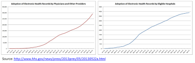 The HHS press release states that, “[a]ccording to the Centers for Disease Control and Prevention (CDC) survey in 2012, the percent of physicians using an advanced EHR system was just 17 percent in 2008. Today, more than 50 percent of eligible professionals (mostly physicians) have demonstrated meaningful use and received an incentive payment”. Examining the 2012 CDC survey results, shown below, it turns out that when talking about “advanced EHR”, HHS is referring to what CDC termed “basic EHR”, which is fine as long as we translate correctly.The CDC survey results clearly show that somewhere around 2004 EHR adoption among office-based physicians began climbing at a more or less constant rate, with over 40% of doctors using an EHR back in 2008, although most were probably missing this or that functionality classified as basic by the CDC (and advanced by HHS). Beginning in 2008, prevalence of Meaningful Use worthy EHRs (advanced/basic) began increasing at a similar rate. If we place the 50% adoption rate of 2013, inferred from payment of incentives by HHS, on the CDC green line graph, it should fall into the same linear growth behavior as previous years. We will have to wait for the 2013 CDC survey, but my guess would be that while the blue “Any EMR/EHR System” line will flatten significantly, the green line will shoot up and eventually converge with the blue one. The reason for this is that there really are no serious EHR products today that don’t fit the "basic/advanced" criteria, and most people that have a non Meaningful Use compliant EHR, are upgrading to a version that has all the bells and whistles.