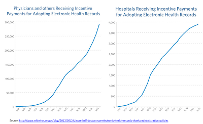 Of course, the graph titles are incorrect, since there were plenty of electronic medical records in use well before 2011, and the actual text of the press release does make some references to the world prior to 2011 (more on that below). The White House, eager to display such enormous success, posted the announcement on its own blog and fixed the titles to indicate that these are graphs depicting distribution of HITECH incentives for Meaningful Use, not necessarily Electronic Health Records (EHR) adoption rates as HHS mistakenly labeled them. And while at it, the White House blog saw fit to make the pictures a bit narrower so the growth slope is properly showcased.