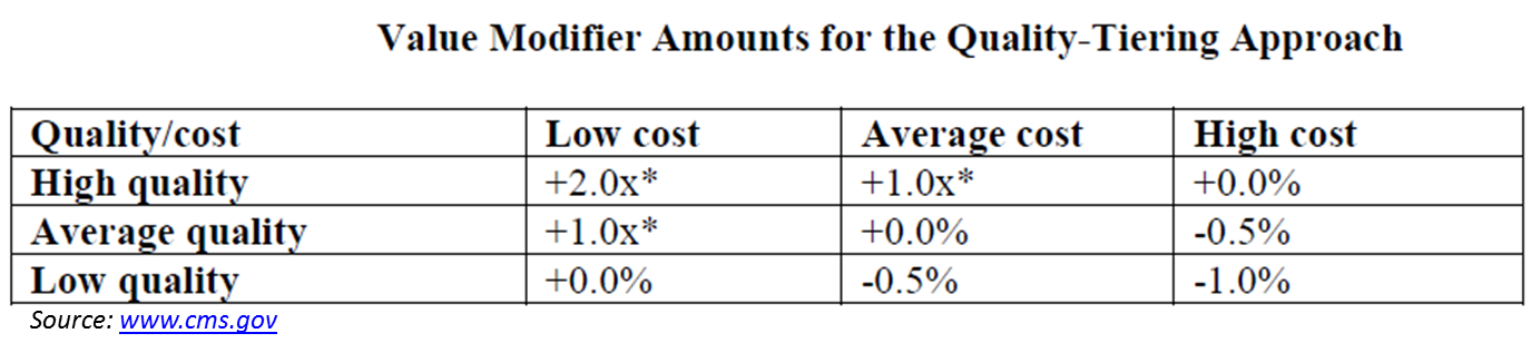 We need to be very clear here that value-based health care is not the same as quality-based health care. The latter means that physicians provide the best care they know how for their patients, while the former means that physicians provide good health care for the buck. To illustrate this innovative way of thinking, let’s look at the newest carrots and sticks initiative, scheduled to take effect for very large medical groups (over 100 physicians) in 2015. Below is a table that summarizes the incentives and penalties that will be applied through the new Medicare Value-based Payment Modifier.